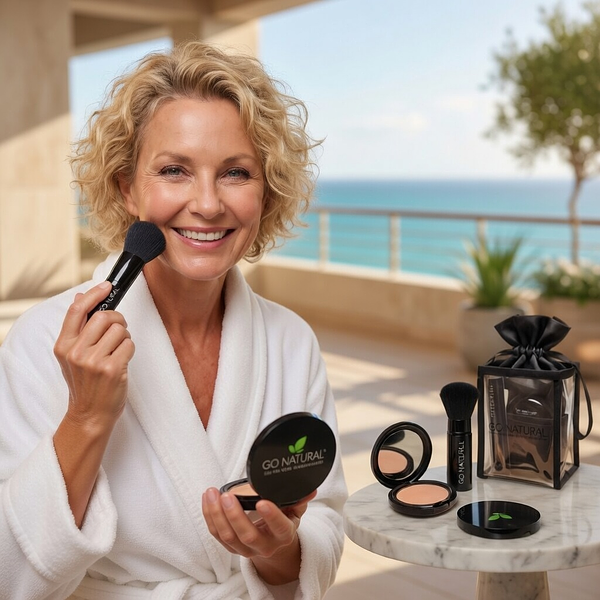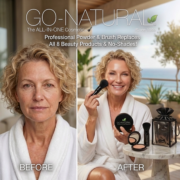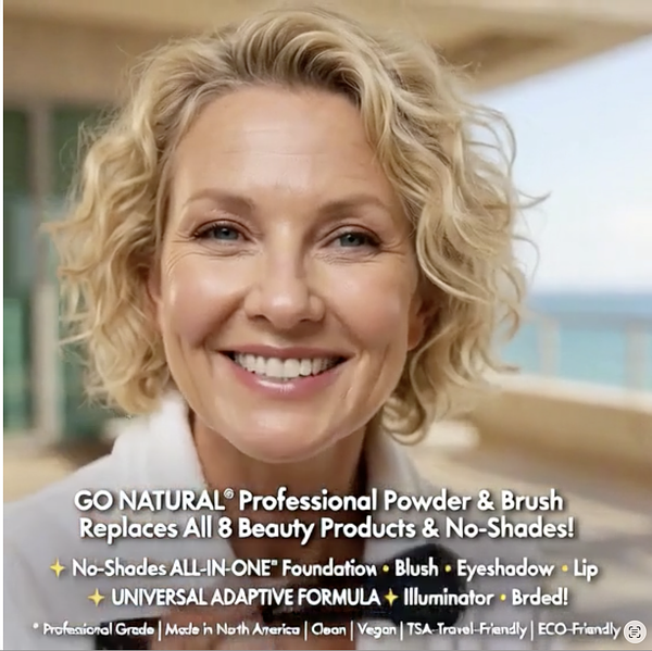 GO NATURAL® Professional Powder & Brush Replaces 8 Beauty Products... and No Shades! ✦ No-Shades ALL-IN-ONE® * Foundation • Blush • Eyeshadow • Lip Color • Concealer • Hi-light • Contour • Illuminator • Brow ✦ Developed By A Licensed Cosmetologist In 1999 To Bring Simplicity To Beauty. The only compact you need. This clean, vegan formula does all 8 beauty products, in seconds! Developed for any skin tone or type, this Go Natural® Powder uses a unique professional grade translucent blend of natural pigments and light reflectors to enhance your bone structure, natural coloring & brighten, while muting fine lines, wrinkles, redness, blemishes, age spots + more. ✦ One compact replaces an entire makeup bag — TSA-friendly, lightweight, and luxuriously simple. ✦ UNIVERSAL ADAPTIVE FORMULA ✦ No Shades Needed! ✦ Endorsed by licensed beauty professionals, busy women and wellness travelers worldwide since 1999. * Professional Grade | Made in America | Clean | Vegan | TSA-Travel-Friendly